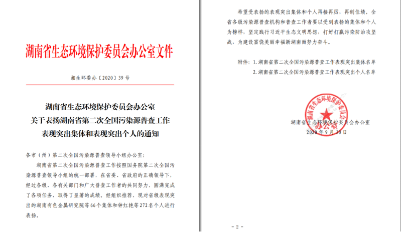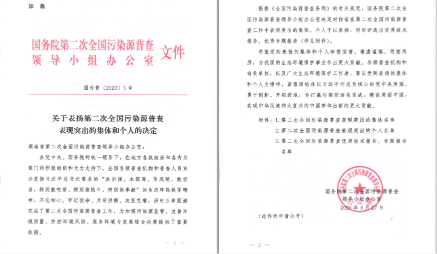 2020年9月29日,國務院第二次全國污染源普查領導小組辦公室發文表揚國家級第二次全國污染源普查表現突出集體和個人。清之源環保參與編制的《湖南省長沙市第二次全國污染源普查技術報告》榮獲第二次全國污染源普查優秀技術報告三等獎;清之源環保科技有限公司合作單位株洲市生態環境局淥口分局獲得第二次全國污染源普查工作表現突出集體。